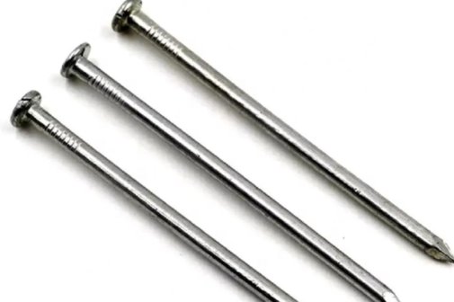 Common nails have a thick shank, a wide head, and a diamond-shaped point.